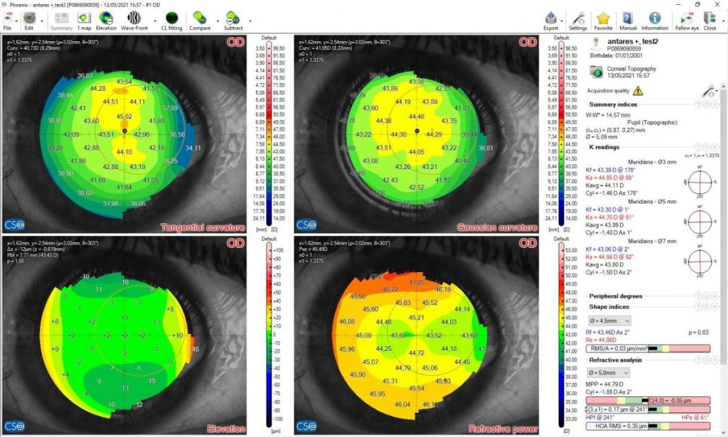 The topography function provides information about the curvature, elevation and refractive power of the cornea. It also provides many parameters to aid in the diagnosis and monitoring of the corneal surface.