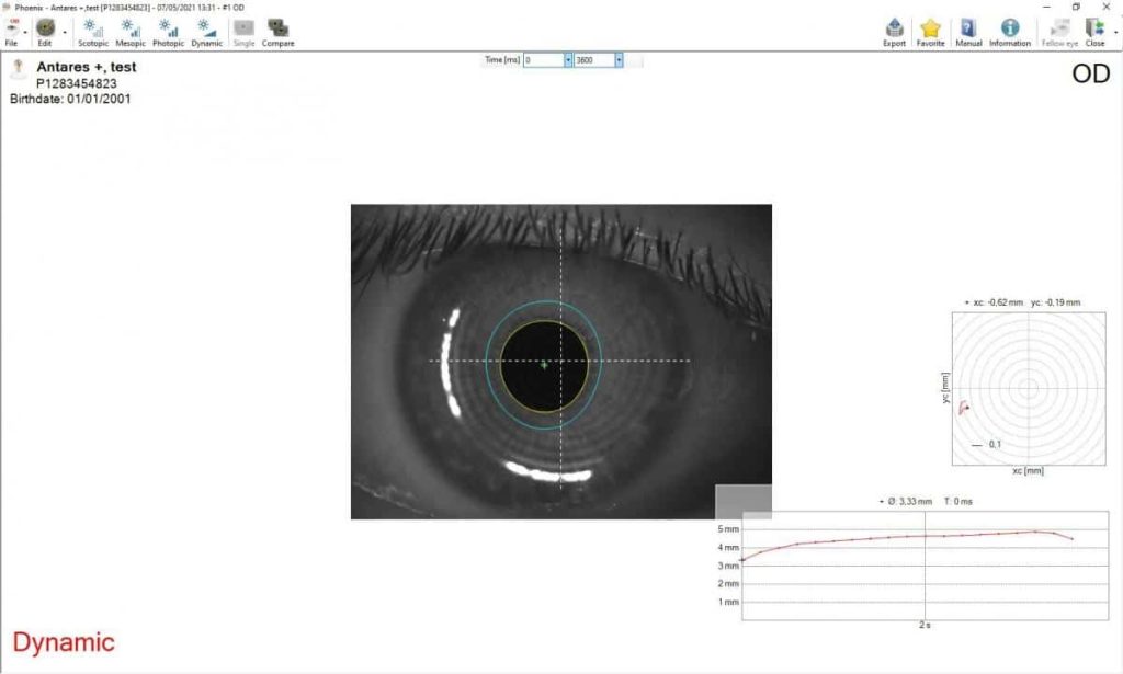 Antares+ has built-in pupillography measurment software. The measurement of the pupil in scotopic (0.04 lux), mesopic (4 lux), photopic (50 lux) conditions and in dynamic modality is fast and simple. Knowing the center and the diameter of the pupil, is essential for many clinical procedures which seek to optimize vision quality.