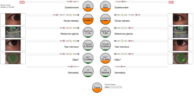Based on the Ocular Surface Disease Index questionnaire (OSDI), limbal and conjunctival hyperaemia, Meibomian glands analysis, tear meniscus analysis, NIBUT, and tear osmolarity, calculated merging together all partial scores, provides an owerall evaluation of the clinical condition of the patient for a comprehesive diagnosis of the dry eye disease.
